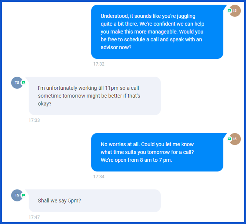 Notice that this prospect says she was working until 11pm. Well after James’ team clock off for the day.