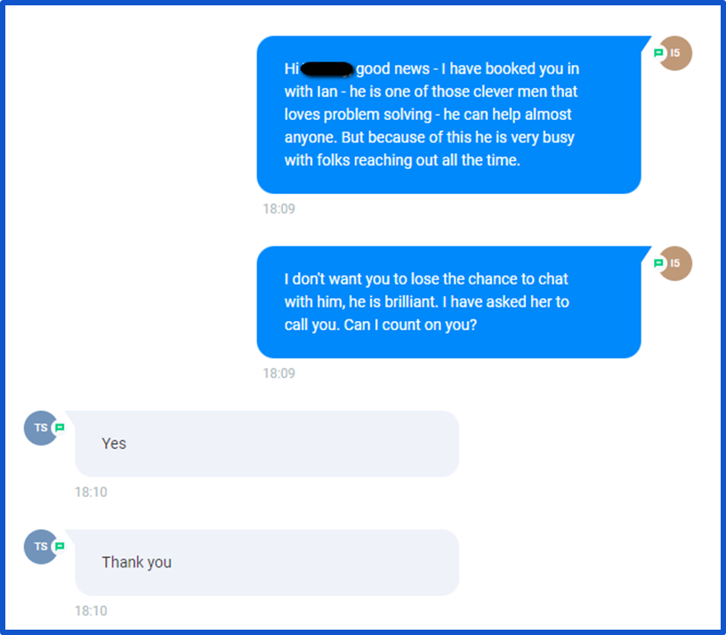 The next message is the humble disarm that brings down their “I’m too busy” defenses and opens up the conversation over SMS.